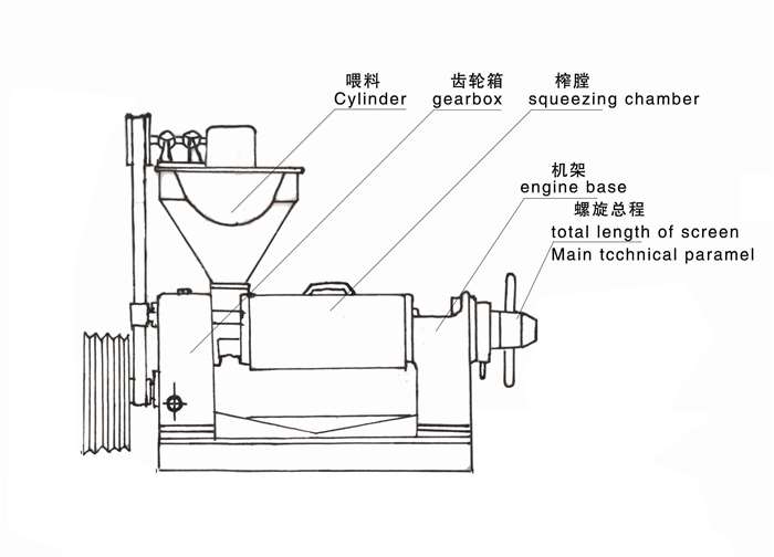 榨油機(jī)運轉(zhuǎn)時,將處理好的料胚帶如料斗,油料從料斗進(jìn)入榨膛。有榨螺的螺旋向里推進(jìn),進(jìn)行壓榨。